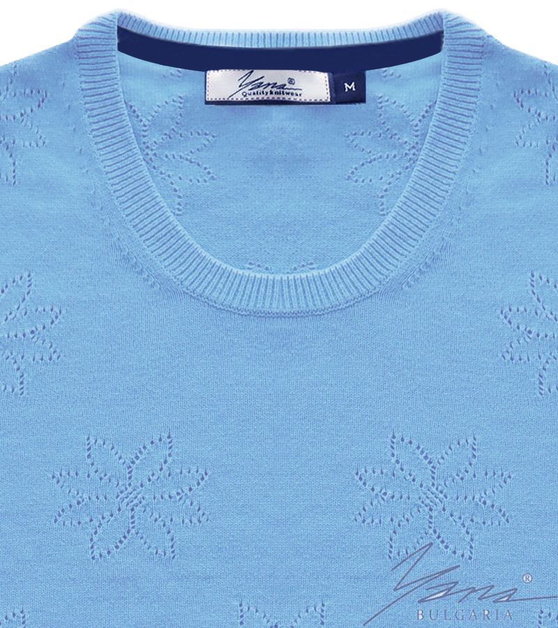 Дамските пуловери на "ЯНА" АД с "О" деколте в ажурена плетка на цветя с къс ръкав, изплетени на 14 файн, са изключително удобни и комфортни при ползване, благодарение на използваните най-добри плетачни световни практики. Най-високи производствени стандарти. Най-екологична финишна обработка благодарение на швейцарската фирма THIES GmbH. Пуловерът е със стилна кройка, съобразена с последните модни тенденции, изплетен е фулифешън, без рязане. Най-актуалните цветове за сезона. Идеален както за офиса, така и за свободното време.