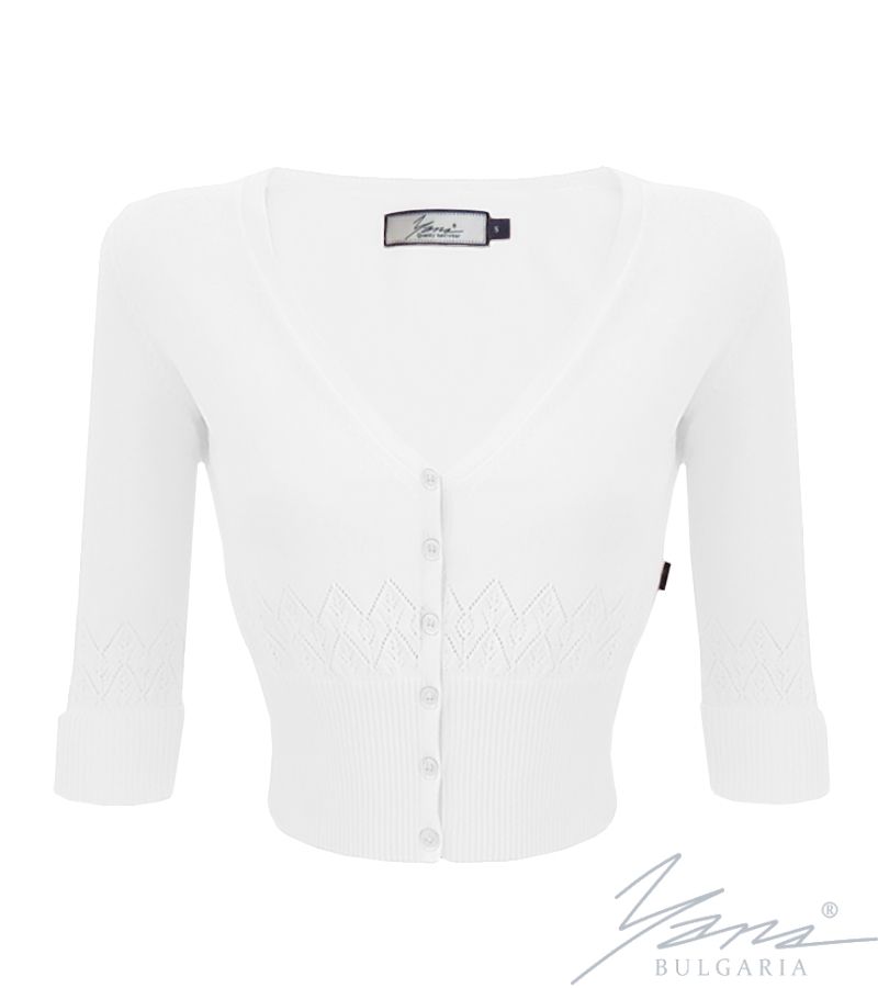 Дамската памучна вталена жилетка на "ЯНА" АД в гладка плетка с нежни ажурни мотиви, удължен ластик и деколте оформено в шпиц, е изключително удобна и комфортна при ползване, благодарение на използваните най-добри плетачни световни практики. Жилетката е с кройка даваща свобода на тялото при движение, изплетена е фулифешън, без рязане. Жилетката се закопчава с 6 копчета, и има по 2 копчета за декорация на ръкавите. Най-високи производствени стандарти за 100 % памук. Най-екологична финишна обработка благодарение на швейцарската фирма THIES GmbH. Най-актуалните цветове за сезон Пролет-Лято. Изключително подходяща като самостоятелна дреха и идеална в комплект с потник или рокля от нашата колекция, в същият цвят или комбинация в различни цветове.