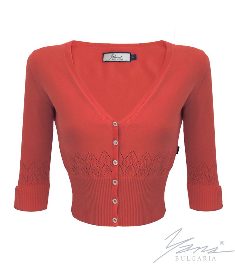 Дамската памучна вталена жилетка на "ЯНА" АД в гладка плетка с нежни ажурни мотиви, удължен ластик и деколте оформено в шпиц, е изключително удобна и комфортна при ползване, благодарение на използваните най-добри плетачни световни практики. Жилетката е с кройка даваща свобода на тялото при движение, изплетена е фулифешън, без рязане. Жилетката се закопчава с 6 копчета, и има по 2 копчета за декорация на ръкавите. Най-високи производствени стандарти за 100 % памук. Най-екологична финишна обработка благодарение на швейцарската фирма THIES GmbH. Най-актуалните цветове за сезон Пролет-Лято. Изключително подходяща като самостоятелна дреха и идеална в комплект с потник или рокля от нашата колекция, в същият цвят или комбинация в различни цветове.