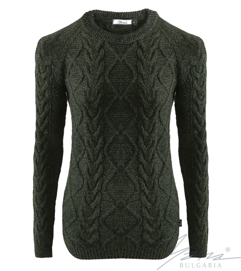 Вълнените дамски пуловери на "ЯНА" АД с "О" деколте в структурна плетка Арани и Осмици с дълъг реглан ръкав изплетен на 5 файн са изключително удобни и комфортни при ползване, благодарение на използваните най-добри плетачни световни практики. Най-високи производствени стандарти за вълнени тъкани. Най-екологична финишна обработка благодарение на швейцарската фирма THIES GmbH. Пуловера е със стилна регулар кройка, съобразена с последните модни тенденции, изплетен е фулифешън, без рязане. Най-актуалните цветове за сезона. Идеален както за офиса така и за свободното време. Тегло: 330 грама.
